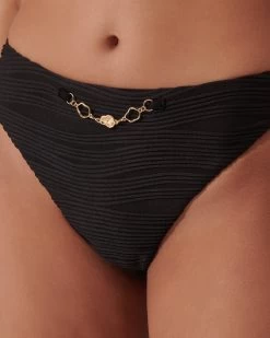 Step into summer with the high-waisted bikini bottoms in timeless black. The unique waved design and high-rise fit are finished with gold-tone chain embellishments for ultimate poolside glamour. The Brazilian brief style gives just enough coverage to ensure a flattering silhouette on the beach and beyond. Pair with the matching Orta triangle bikini top for the full look.