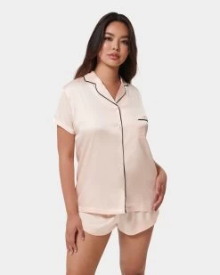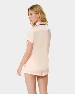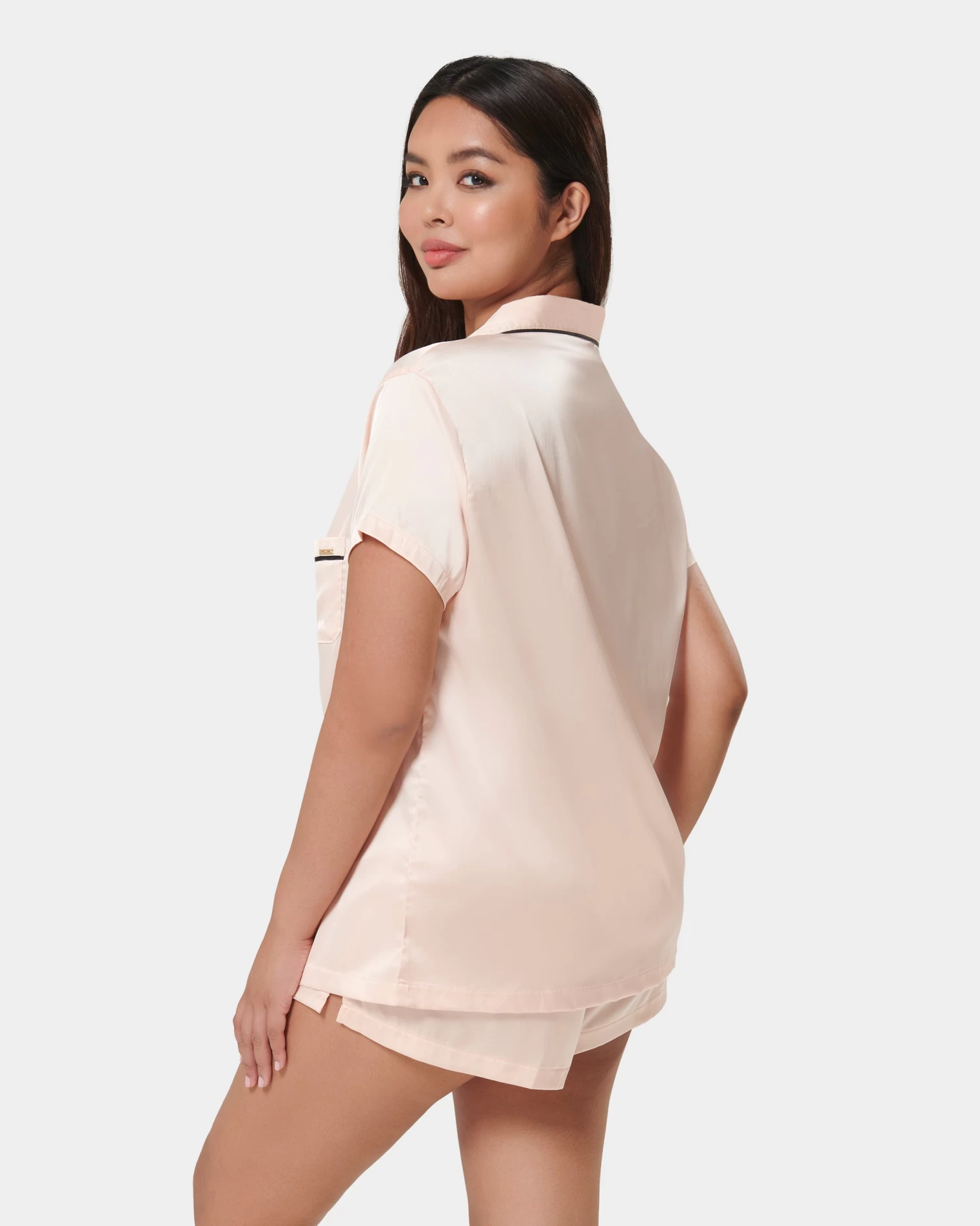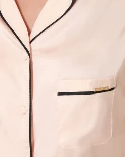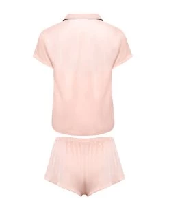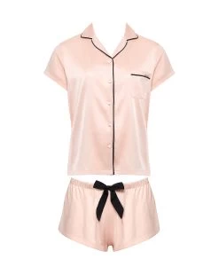 Channel your inner Coco Chanel in this beautiful pyjama short set, with a modern twist. The pyjama short set is timeless in style, with a nod to the elegant pyjamas worn by Coco Chanel. The soft pink satin shirt is trimmed with black satin piping along the collar and pocket, while the short is finished with a large black satin bow for a modern take on a classic pyjama look.