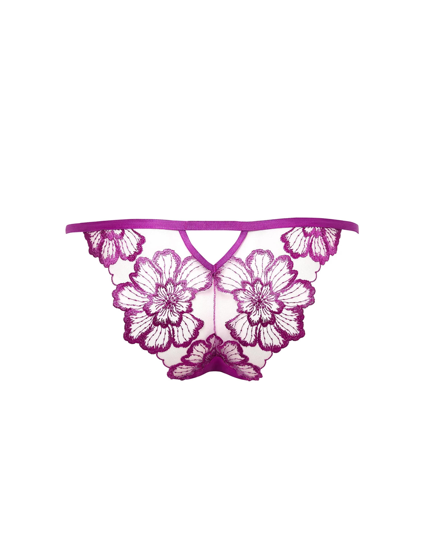 The Catalina brief embodies a harmonious blend of beauty and provocation. From the deep purple hue to the captivating semi-sheer finish, everything about this piece evokes refined elegance. Intricate embroidery and delicate floral motifs adorn the fabric, ensuring an artistic final look. For a complete ensemble, we recommend styling the Catalina brief with the matching bra and thigh harness, creating a look that exudes confidence and sensuality.