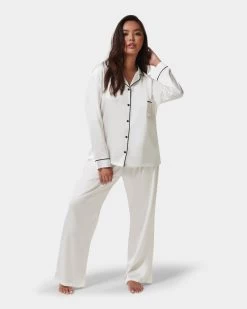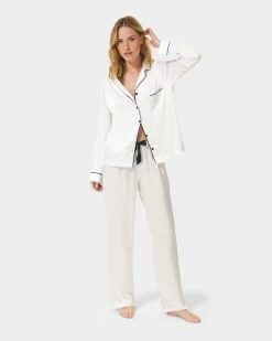 The soft  satin shirt is trimmed with  satin piping along the collar, pocket and cuffs, while the trouser is finished with a large black satin bow for a modern take on a classic pyjama look.