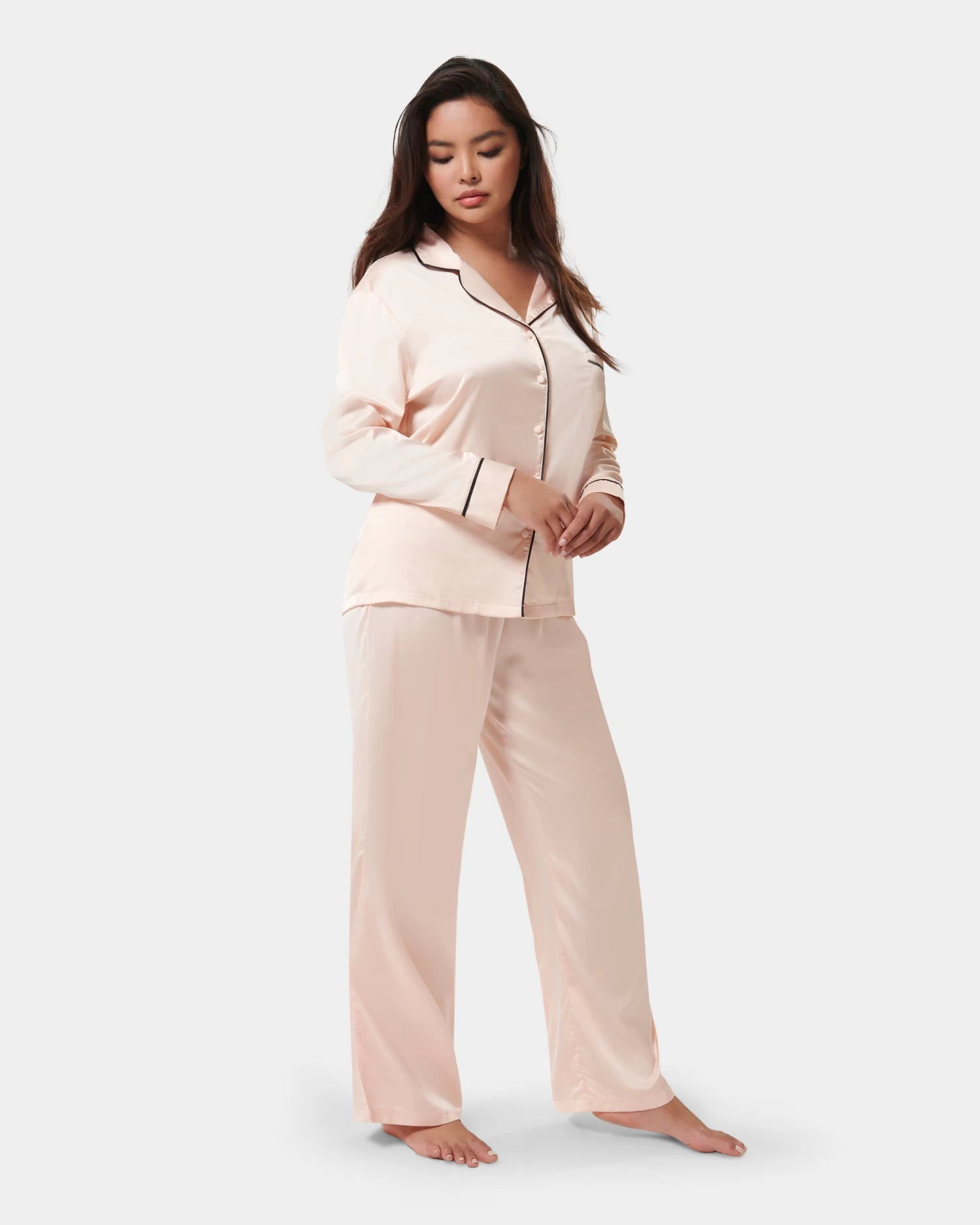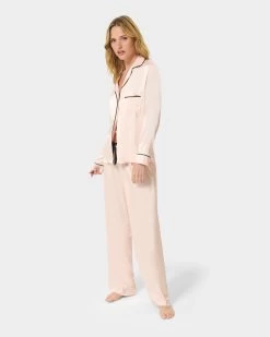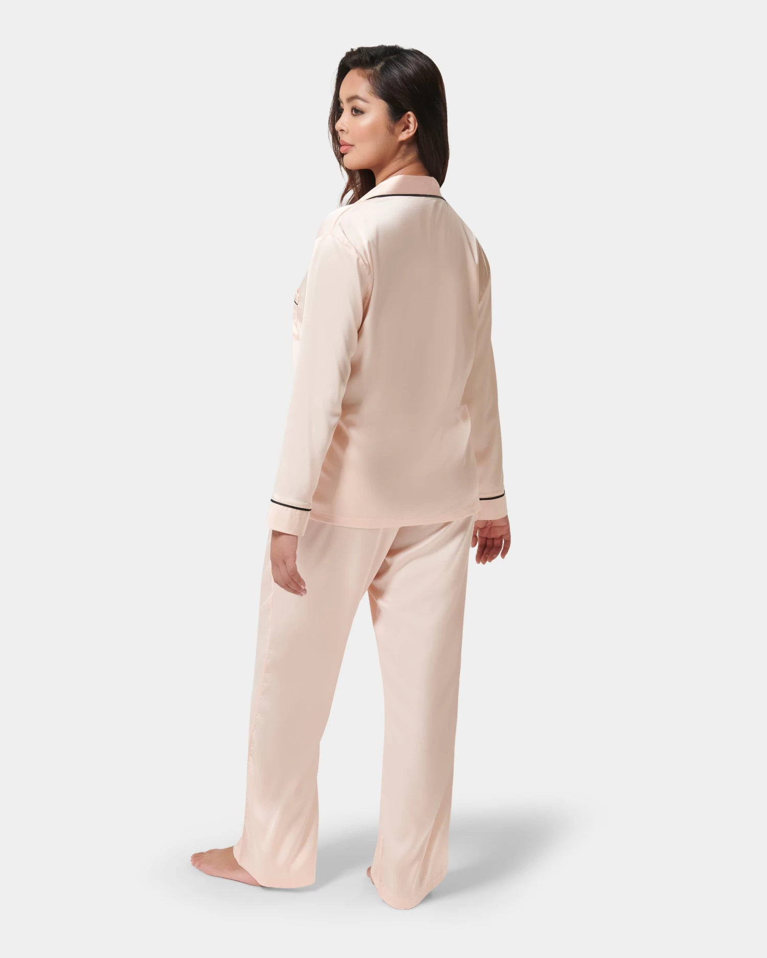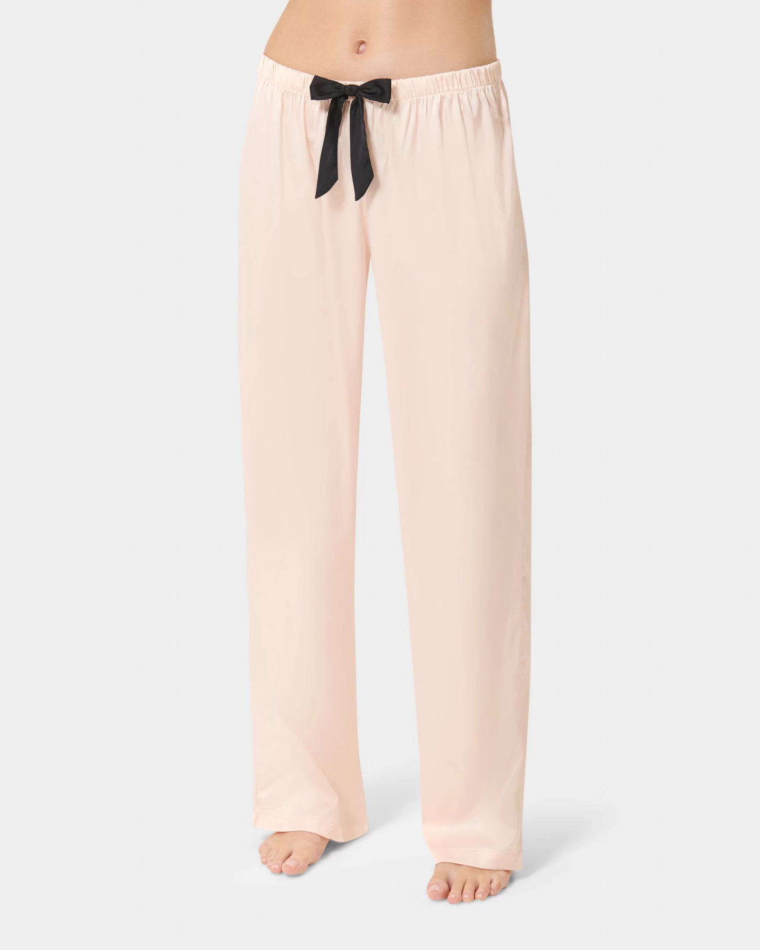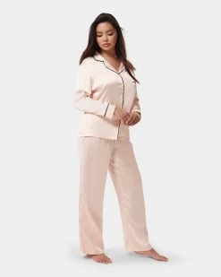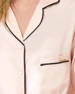 Channel you inner Coco Chanel in this classic pyjama trouser set, with a modern twist. This sweet pyjama trouser set is timeless in style, with a nod to the elegant pyjamas worn by Coco Chanel. The soft pink satin shirt is trimmed with black satin piping along the collar, pocket and cuffs, while the trouser is finished with a large black satin bow for a modern take on a classic pyjama look.