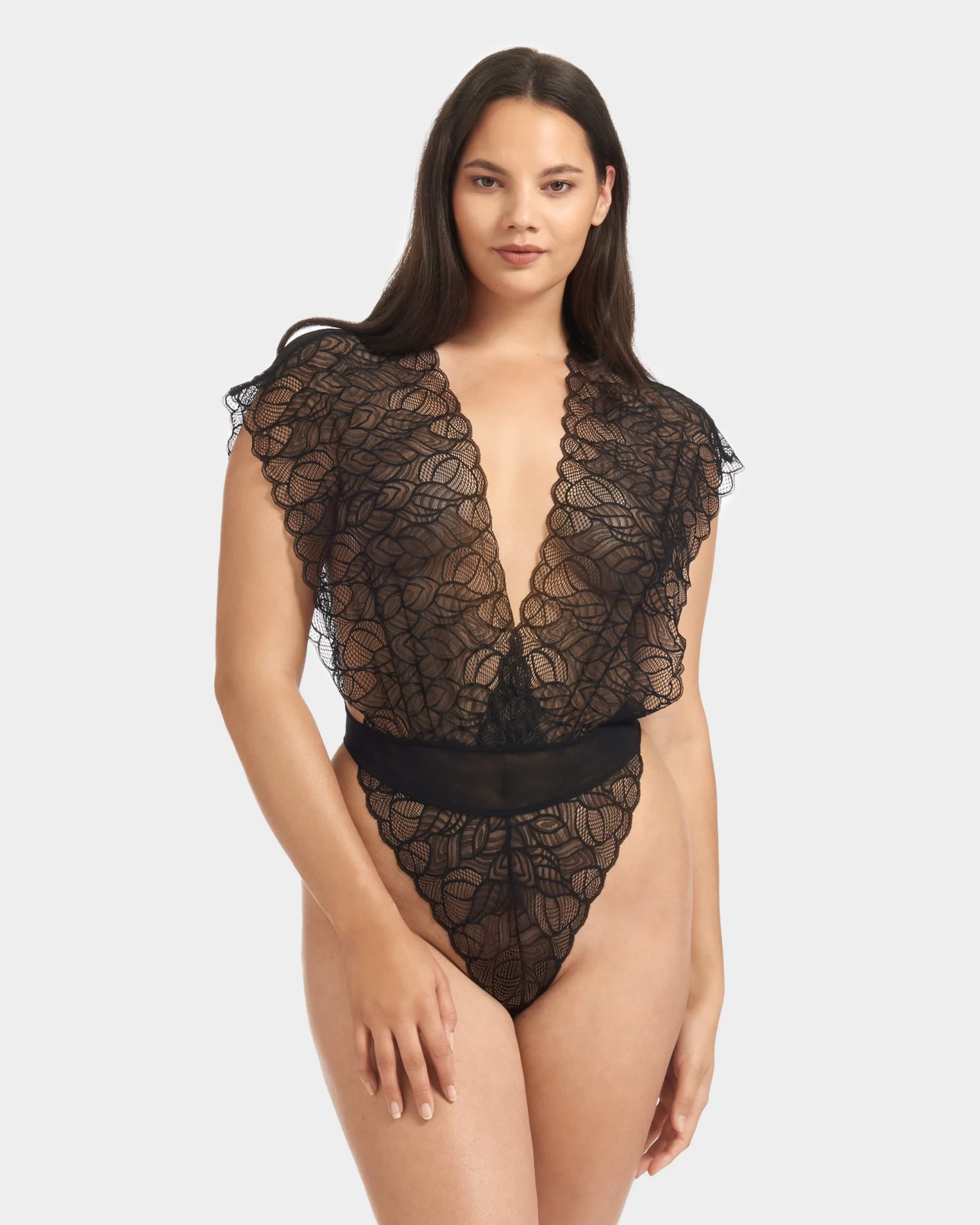 Softly seductive lace body with wide lace panels, which sit beautifully against your skin. With a dramatic deep plunge to the front and back, and high cut leg, the Emerson all over lace body can be worn both as a lingerie piece or under your favourite outerwear.
