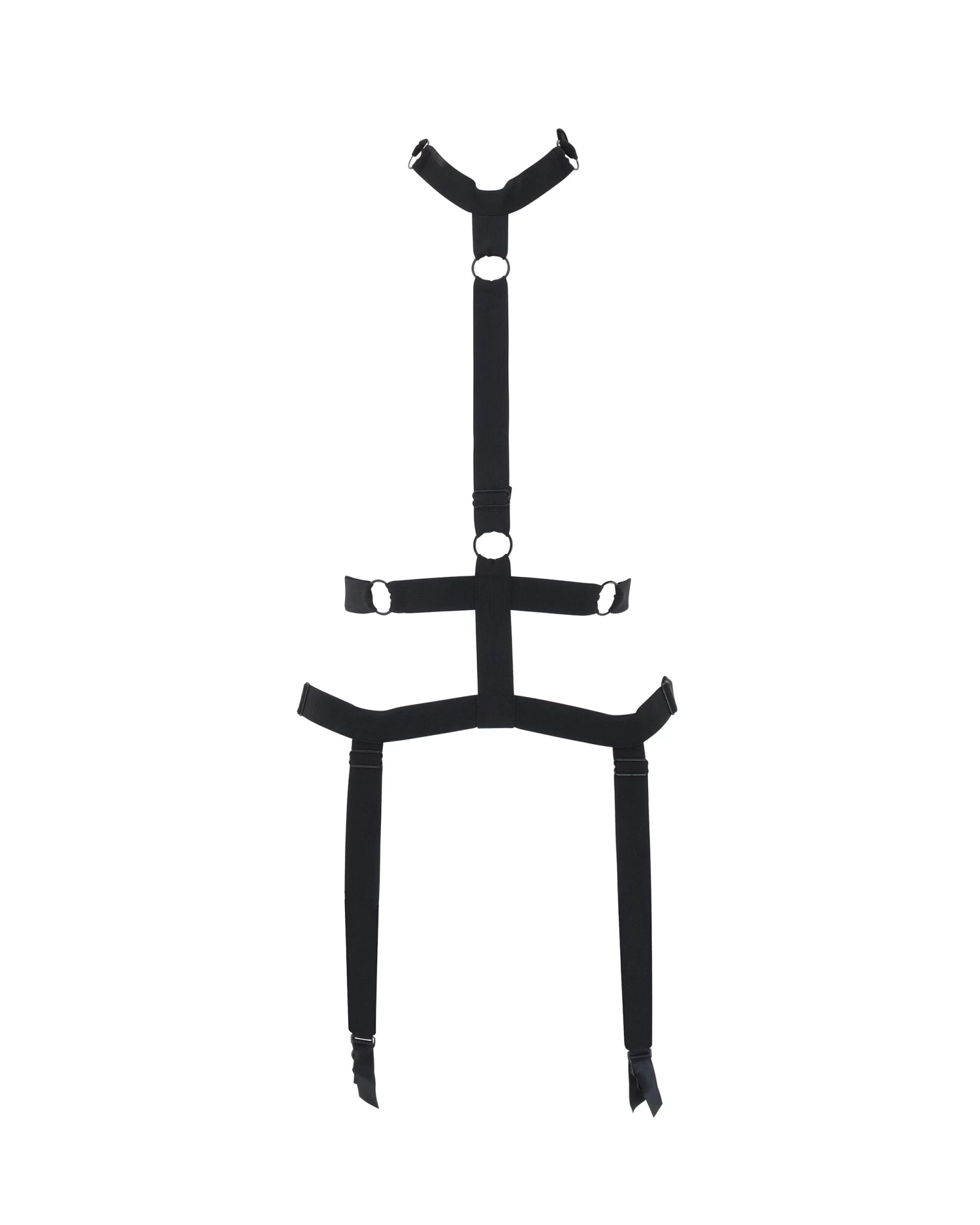 A striking and provocative piece, the Emilia Harness is perfect for making a bold statement. Broad lines of elasticated banding segment the body into flattering sections, structuring and sculpting the frame. The harness is fully elasticated and adjustable for the perfect fit, with hook and eye fastenings securing the horizontal body bands. Adjustable suspender straps are finished with satin ribbon flashes, and black hardware adds a final touch of depth to this intriguing, dynamic piece.