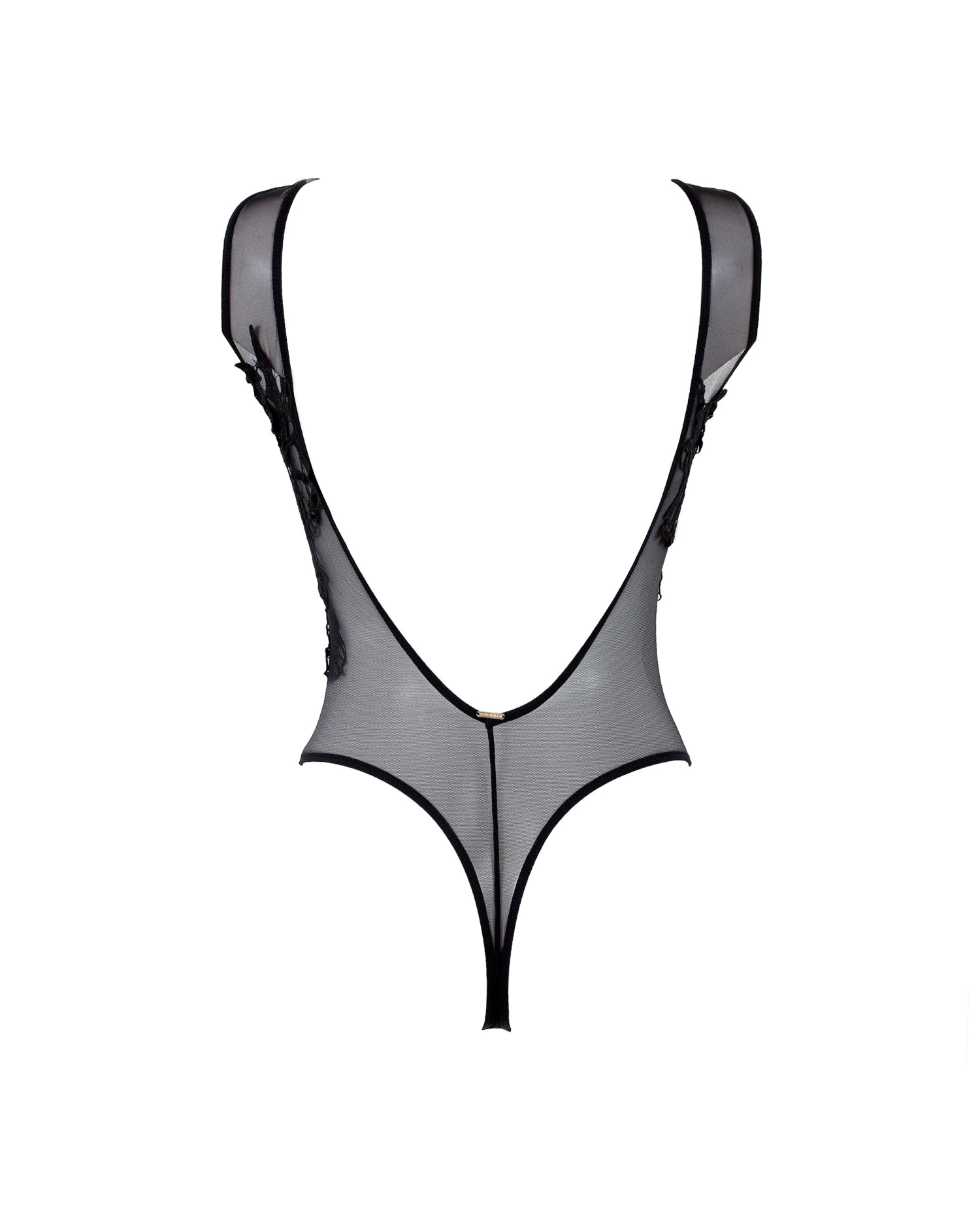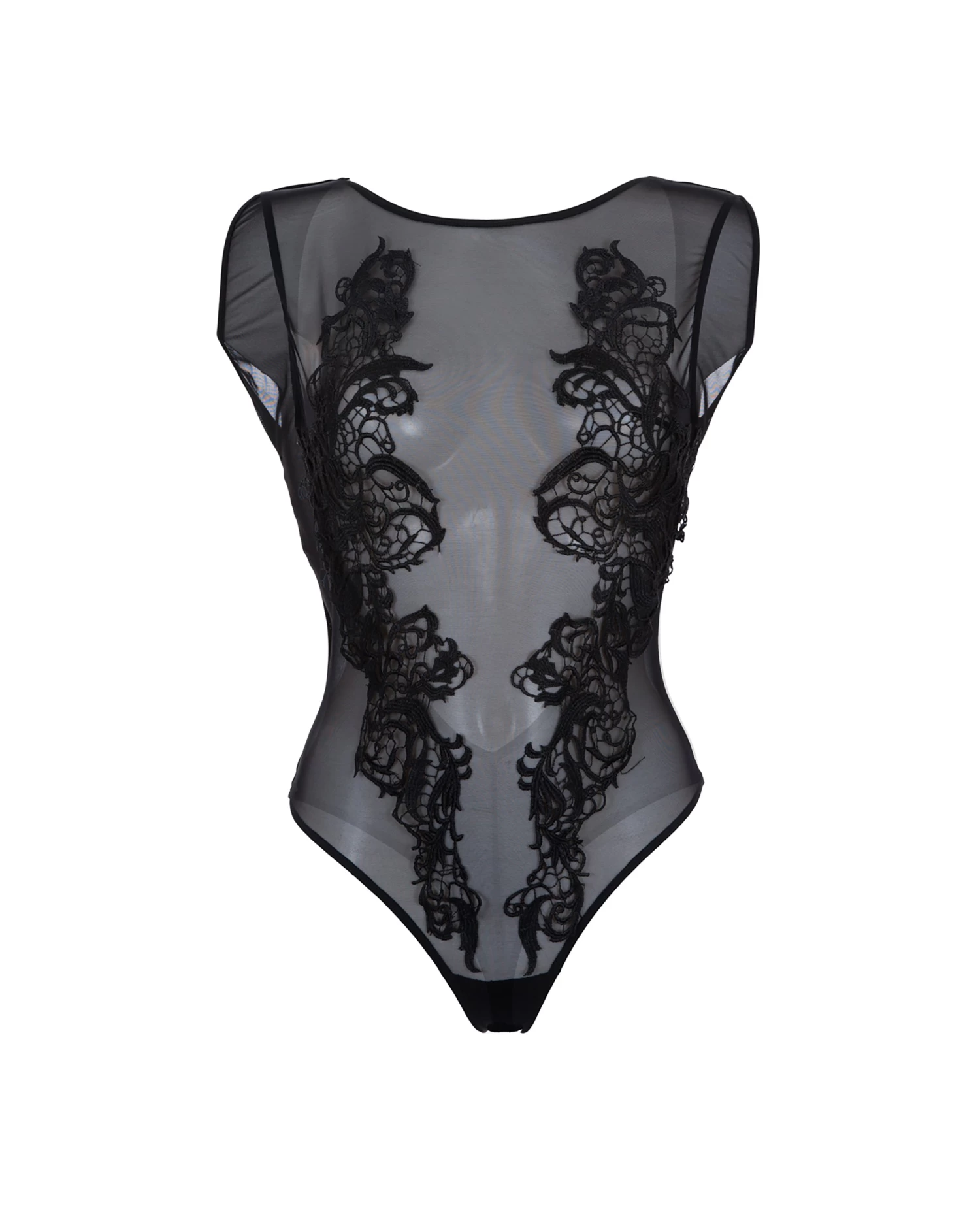 Sheer body with beautiful guipure lace placement trim. Deep plunge back with thong back styling. Style with your favourite outerwear for a fashionably chic evening look.