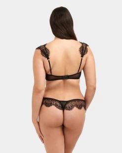 Beautiful thong in eyelash lace and semi sheer mesh. The deep lace extends around the waistline to sit delicately against the skin. Softly elasticated waistband and traditional thong back styling. Wear with the matching bra to create a romantically chic statement.