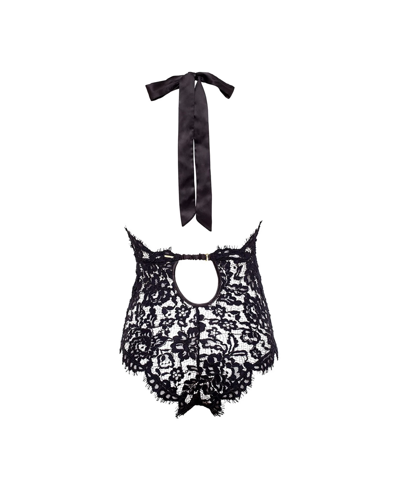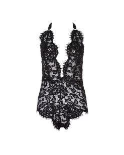 Luxurious corded lace body with seductive halter neck ribbon tie. Beautiful scooped low back detail and plunging neckline. Edged in soft elastic to hug the contours of the body creating an irresistibly sexy silhouette.
