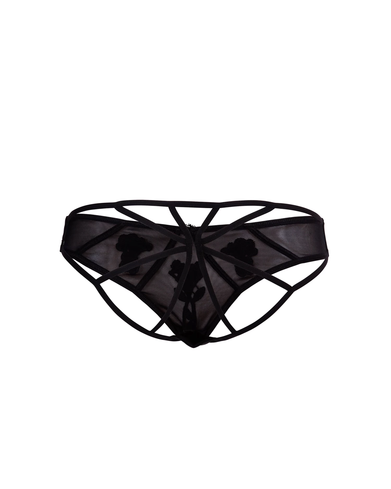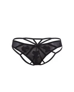 A stunning, bikini-style brief combining superfine mesh with directional strapping and appliqué lace motifs. Deliciously soft, the superfine mesh sits comfortably against the skin whilst elasticated banding ensures the perfect fit and feel. A central diamante adds a light focal point, and guipure lace details centred in front panels bring textural intrigue. The provocative open back is structured with slim banding, creating a web-effect that flatters the form. Wear with the Nova Bra for a beautiful, sensual look.