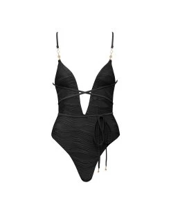 Elegant and versatile, the black Orta multi-way plunge swimsuit boasts multiple styling options with its strap-tie design. Fluid wave patterns and tactile fabrics offer an elegant touch, while the multi-way design adds a contemporary twist, perfect for all your styling needs.
