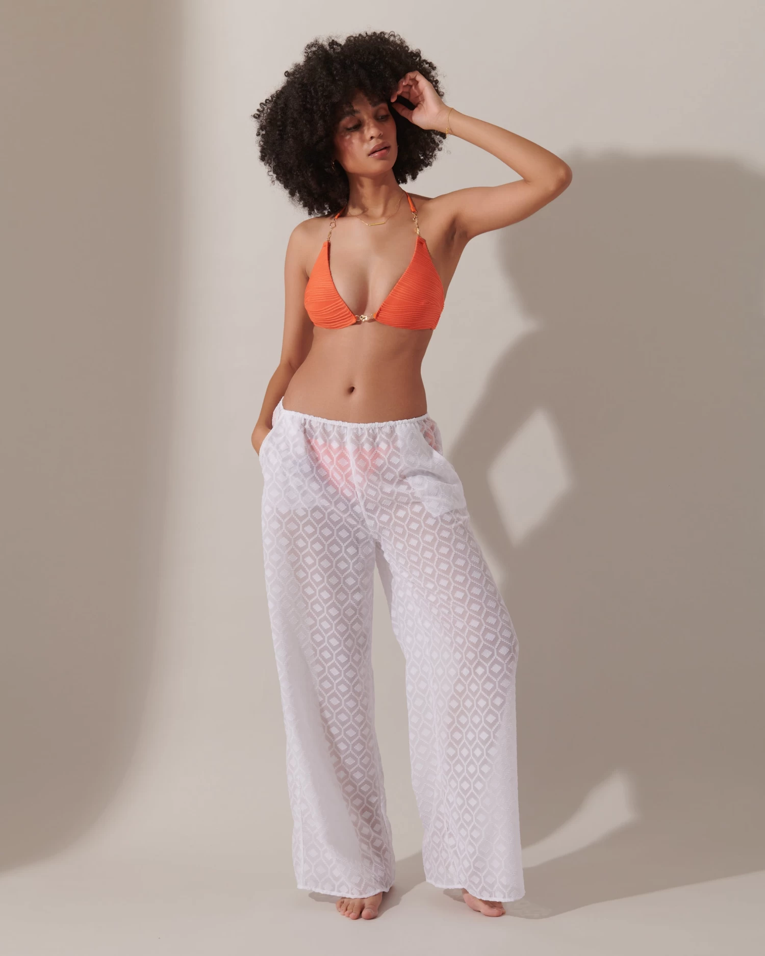 Radiate tropical vibes with the triangle bikini top. Gold-tone chain embellishments and sensual wave pattern textures elevate your beach style in a standout orange hue. Mix and match with the matching Orta high-waisted bikini bottoms for the full look.