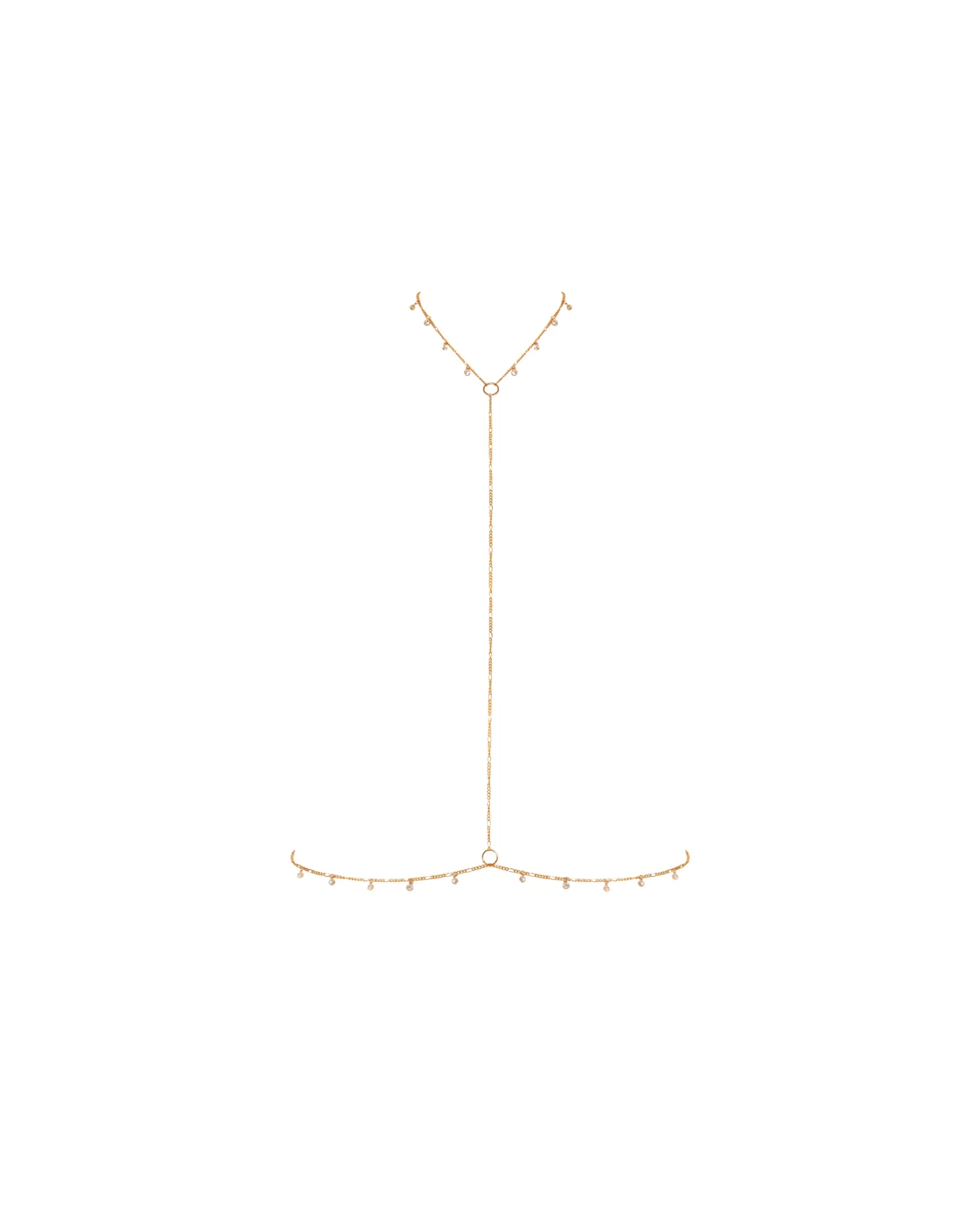 Experience the exquisite balance of subtlety and grandeur as the Petra harness adorns your form. The minimalistic framework celebrates simplicity, ensuring your natural beauty takes centre stage, while the opulent gold-tone chains add a touch of regal splendour that’s impossible to forget. With every movement, you’ll command attention and leave a lasting impression, especially when styled with the matching Petra pieces.