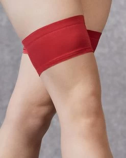 Spice up your hosiery with these gorgeous hold ups. A wide plain top band in vibrant red sits smooth against the skin, with soft silicone banding keeping the hold ups in place all day and all night. This is directional and contemporary hosiery for the modern lingerie lover. Model is wearing Enya Bra and Thong in red.