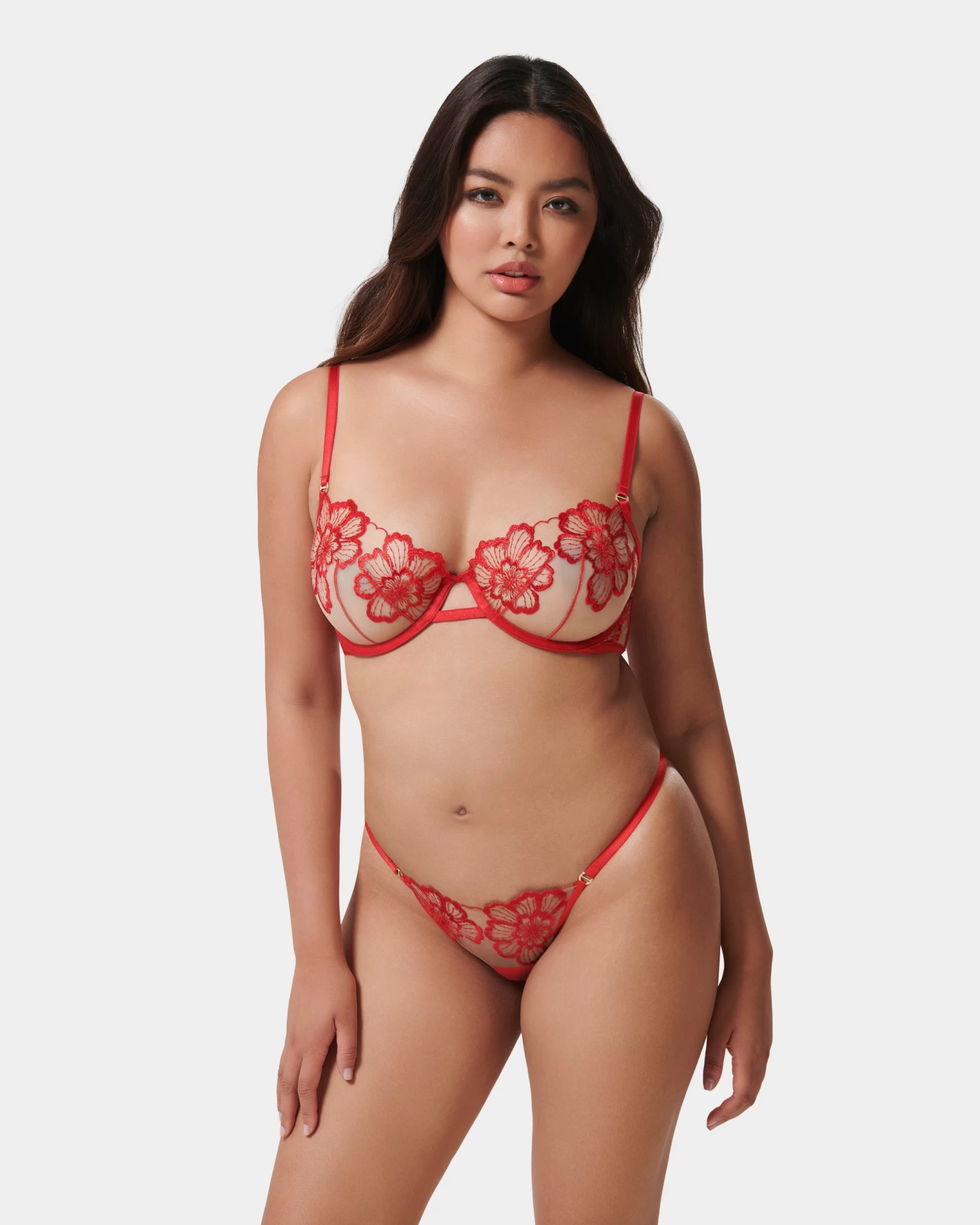 Drenched in striking red, the Catalina commands attention with its exquisite design and luxurious details. The bra, adorned with delicate floral embroidery, embraces the curves with grace and allure, while the matching thong and brief showcase sheer structures that evoke an air of tantalising mystery. Completing the ensemble is the thigh harness, an enchanting accessory that adds a touch of playfulness and seduction.