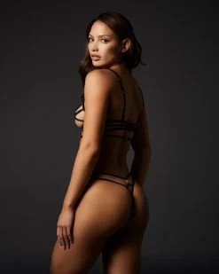 With its bold array of directional straps, the Shirin set is your go-to choice for a departure from lace and embroidery while still making a captivating statement. Whether you choose the classic bra and thong duo or elevate your ensemble with a complete look featuring the suspender belt, you’re destined to embody a flawless expression of lingerie perfection.