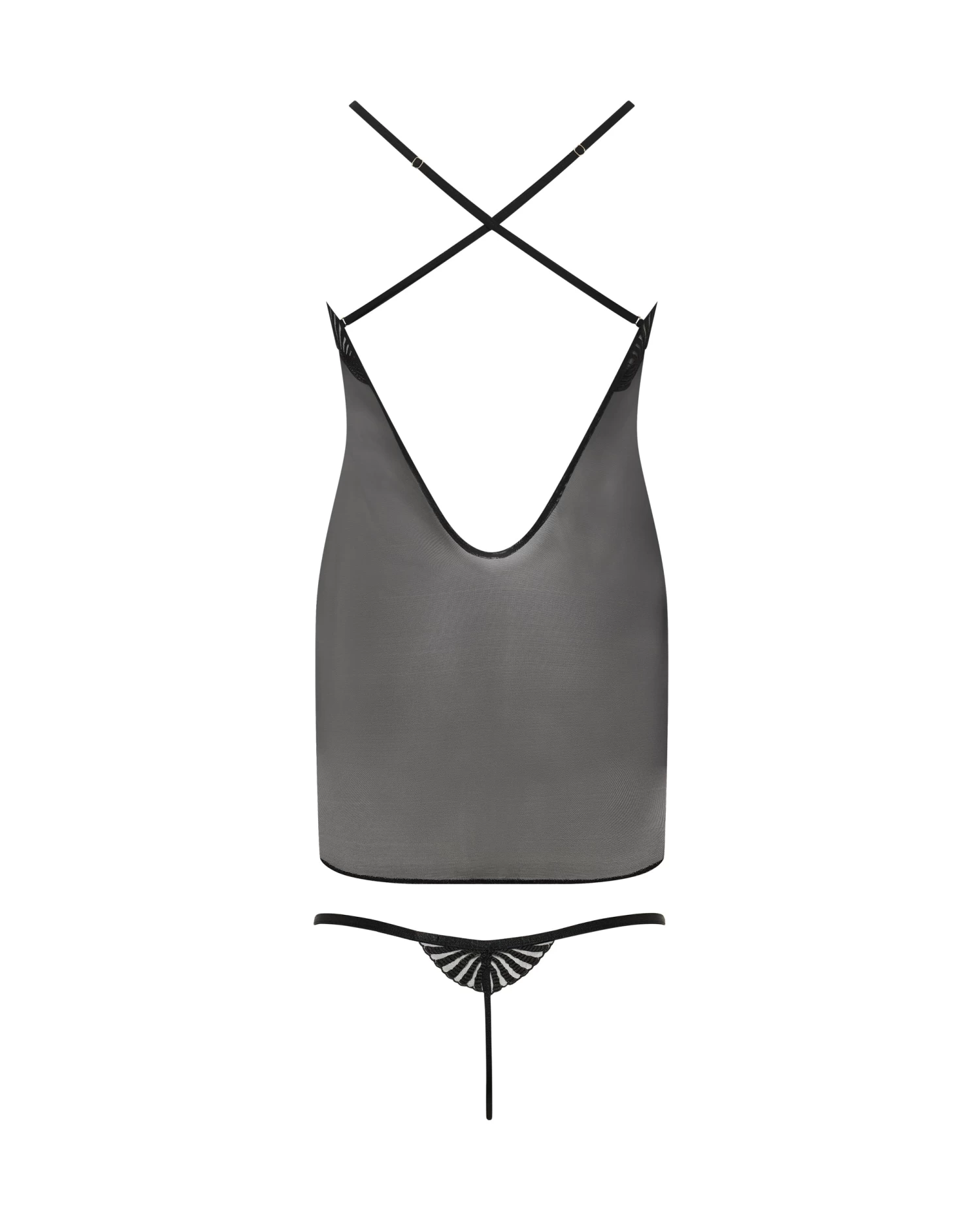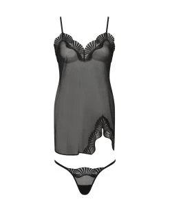 The Trista chemise and thong set exudes an alluring charm with its delicate see-through fabric, allowing glimpses of your skin to tantalise and ignite the imagination. Crafted from lightweight materials, this ensemble wraps you in a gentle embrace, offering both comfort and a touch of luxury. Add it to your nightwear edit to experience decadent indulgence like never before.